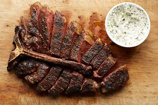 To serve: Cut meat off both sides of the bone, leaving you with two pieces of steak. Slice each steak across the grain, then rearrange the slices around the bone on a platter. Serve with herbed butter.