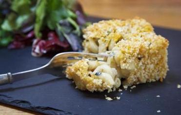 With a knife, mark the macaroni and cheese into 6 squares (you can also make triangles). Using an offset spatula, lift them out of the pan.