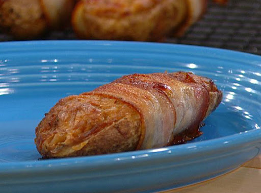 Halve potatoes lengthwise. Scoop out the flesh, season with salt and pepper, and mash with sour cream, remaining butter, cheese and caramelized onions. Fill potato skins with mashed potatoes and wrap each potato entirely in bacon, overlapping slices a little as you wrap them. Arrange on baking rack set over a baking sheet and roast until bacon is crispy, 15-20 minutes.