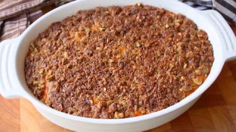 Cook sweet potatoes. Mash and add eggs, butter, sugar, syrup and vanilla. Mix together. Put in casserole dish. Mix topping ingredients together until crumbly. Spread over potatoes and bake at 350 for 30 minutes or until set in the middle.