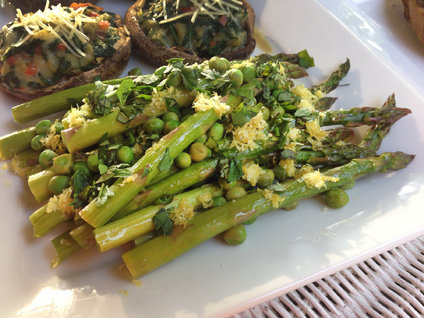 3 lemons2 teaspoons salt2 pounds asparagus (larger spears), trimmed2 to 3 tablespoons extra-virgin olive oil8 ounces frozen peas½ cup chopped fresh basil½ cup chopped fresh parsley