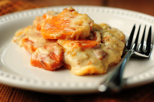 Arrange half of the sweet potatoes in the bottom of an 11×7 inch baking dish.