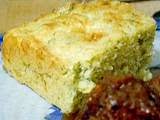 Pour the batter into the prepared pan, smooth the top, and sprinkle with the remaining grated Cheddar. Bake for 30 to 35 minutes, or until a toothpick comes out clean. Cool and cut into large squares. Serve warm or at room temperature.