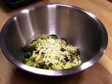 Cut the broccoli florets into bite size pieces. Cut the stalk into 1/8-inch thick, round slices. Place the broccoli into a mixing bowl and toss with the olive oil, garlic, kosher salt and pepper and set aside.