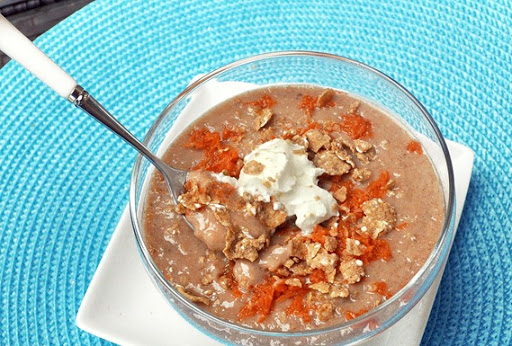 Steam the carrot first, then combine all of the ingredients in a food processor, blender, or Magic Bullet. Blend until smooth. Now eat! Optional: top with walnuts, shredded carrots, cinnamon, and/or raisins.