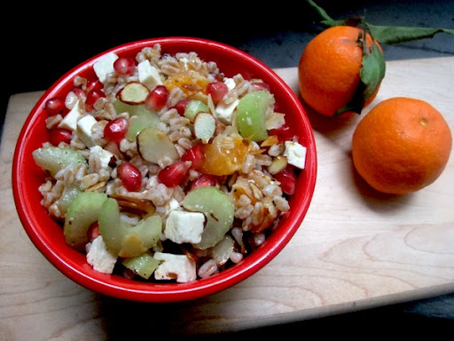 Bring a pot of water to boil and add the farro, cook for 10- 15 minutes or until al dente (or cook according to package instructions). In a bowl combine the feta, almonds, tangerines (remove any seeds) and celery. Whisk together the lemon juice, olive oil and ginger in a bowl.