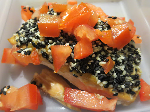 In a small bowl, combine sesame seeds. Sprinkle on top of salmon.