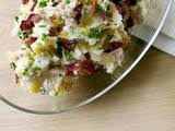 These potatoes taste like skins with the works and sour cream but they are boiled, not fried. The bacon is baked on a slotted broiler pan so the fat falls away. The sour cream is replaced with buttermilk, which is tangy but made from skimmed milk. I use whole milk Cheddar but it is super sharp so a little goes a long way!