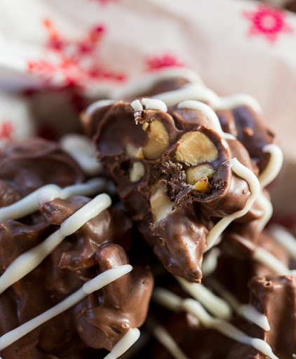 Place the 8 ounces of white chocolate almond bark in a microwave safe bowl. Microwave on HIGH at 30 second increments, stirring in between until melted. Let cool slightly and place in a plastic bag. Snip the corner of the bag and drizzle over nut clusters.