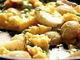 Cook the peas in the boiling water, and at the last minute, tip in the potatoes just so they heat up. Drain and turn into the pan with the bacon and take off the heat. Whisk the eggs with the cheese and then pour this over the potatoes and peas in the pan. Mix well and pour straight into a bowl to serve.