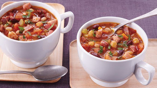 In slow cooker, stir together vegetable mixture, broth, navy beans, chickpeas, kidney beans, tomatoes and cubed ham. Add ham hock. Cover; cook on Low heat setting 4 hours.