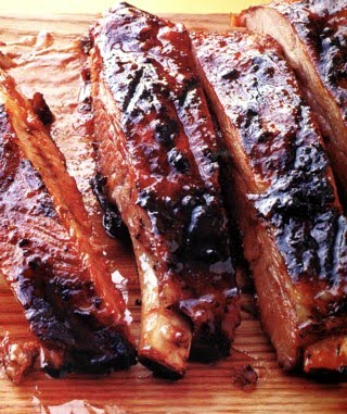 4. Preheat a grill to low heat on one side. Cook the ribs bone-side down on the cooler side of the grill, covered, until tender, about 2 hours 30 minutes. (If using a charcoal grill, add more charcoal as needed to maintain the temperature.) Continue to cook, uncovering every 10 minutes to baste with the sauce, until the ribs are glazed, about 40 more minutes. Remove from the grill and cut into pieces.