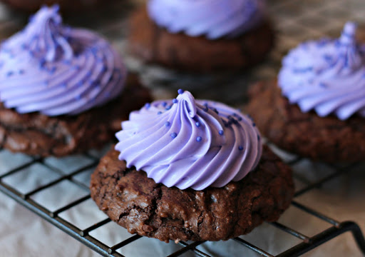 Tint frosting with purple food coloring until desired color is reached. Spread or pipe 1-2 Tbsp. frosting on each cookie.