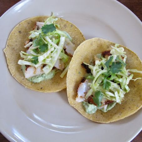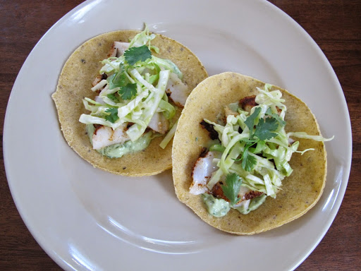 These fish tacos may be the easiest ever! Just grill the fish and place in warm tortillas with shredded cabbage and cilantro. Sprinkle lime juice and cayenne.