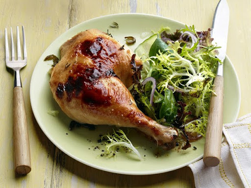 Roast the chicken, basting with the pan juices halfway through, until the skin is amber and a thermometer inserted into the thigh registers 160 degrees F, about 45 minutes. Transfer to a platter and top with the pan juices.