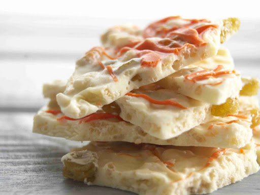 Add the puffed rice and raisins to the large bowl of chocolate and stir until well combined. Pour the mixture onto the baking sheet and with an offset spatula, spread it to an even thickness, about 1/4-inch. Tap the pan firmly several times on the counter to settle the chocolate. With a small spoon or fork, drizzle stripes of orange tinted chocolate over the surface of the bark.