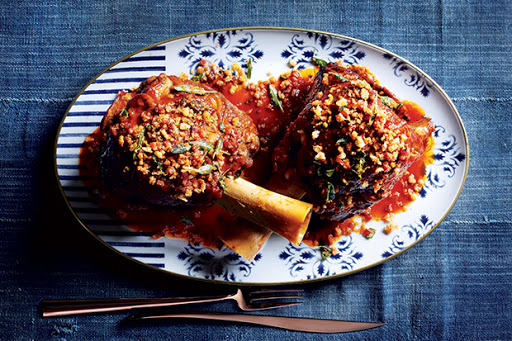Spoon some braising liquid over veal shanks and top with breadcrumbs. Serve remaining braising liquid alongside for pouring over.