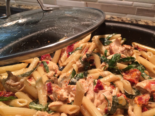 Slice sun-dried tomatoes into smaller bits and add them back to the skillet with chicken. Add half and half and cheese to the skillet and bring to a gentle boil. Immediately reduce to simmer and cook, constantly stirring, until all cheese melts and creamy sauce forms. If the sauce is too thick -don't worry - you'll be adding some cooked pasta water soon. Add cooked pasta to the skillet with the creamy sauce, and stir to combine. Add 1 tbsp of basil, and at least 1/4 tsp of red pepper flakes. Stir to combine.