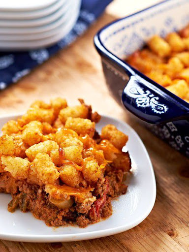 Place the meat and cheese mixture into a 13" x 9" baking dish. Top with 2 cups of cheddar. Spread the tater tots over the surface of the meat and cheese. Top with the remaining cheese and bake for 45 minutes, or until bubbly and the tater tots have browned.
