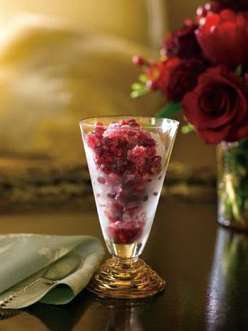 Once the mixture is frozen, chop it up with a knife or ice pick, transfer the ice to a smaller container, and store tightly covered in the freezer until time to serve.