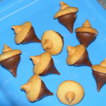 After all the Hershey's kisses have been attached, attach a chip to the top of each "acorn" in pretty much the same manner above, maybe using a tad less "glue".