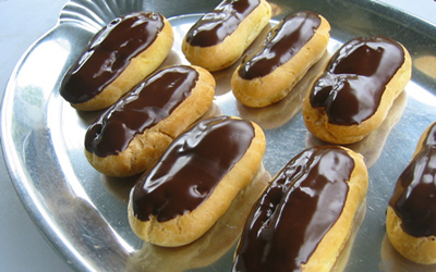 Bake at 425 degrees, rotating the pans once for 15 minutes. Reduce heat to 325 degrees and rotate pans once during baking. Bake for 25-30 minutes. Remove from oven and immediately poke a hole in one end of the eclairs to release steam. Let cool completely.