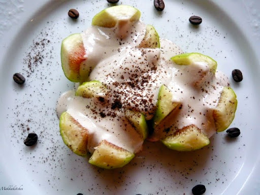 Cream the yoghurt along with syrup and liqueur, fill with this cream the opened figs. Sprinkle with ground coffee and garnish with coffee beans.