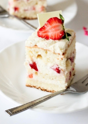 Place one sponge layer cut-side up on a cake board and lightly brush the surface with the simple syrup. Spread a thin layer of whipped cream over the cake layer and arrange the strawberry cubes over the surface. Spread a thin layer of whipped cream over the strawberries. Brush the cut-side of the second layer with the simple syrup and place it over the first layer. Frost the sides and top of the cake with the remaining whipped cream. Repeat with remaining third layer of cake. Spread a thin layer of cream over top of the cake and return to fridge to chill for thirty minutes.