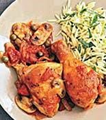 Set the skillet over medium-high heat; add the onion and mushrooms and cook, scraping up any browned bits from the pan, until softened, about 8 minutes. Stir in the tomatoes and their juice, the tomato sauce, capers and remaining basil; season with salt and pepper. Add the chicken to the sauce and bring to a boil. Lower the heat and simmer, stirring occasionally, until the chicken is cooked through and the sauce has thickened, 7 to 10 minutes. Transfer the chicken to 4 plates, top with the sauce and serve the orzo alongside.
