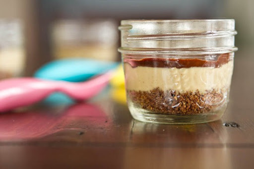 2. In a food processor, process the crust ingredients until crumbs are a bit damp. Add 2 tablespoons of the crust into each jar. Spread out evenly and flatten with fingers.