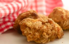Remove chicken pieces from brine and gently rinse off excess brine solution with fresh water. While chicken is still wet from the rinse, immediately dredge it in the flour – it should have a complete coating of flour – and place the chicken piece in the hot oil for frying. Repeat with as many pieces that can fit in pan without overcrowding.