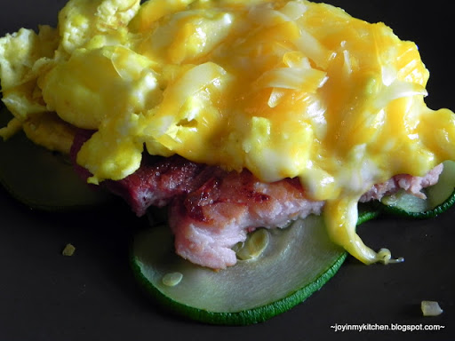 Place the ham slices atop the zucchini and onion mixture. Top with scrambled eggs. And, garnish with cheese, if desired. Enjoy!