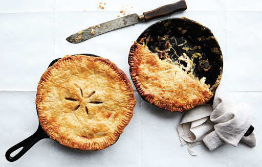 Roll out 1 disk of dough on a lightly floured surface to a 14” round. Transfer to a 10” cast-iron skillet or a 9½”-diameter deep pie dish. Lift up edge and let dough slump down into dish. Trim, leaving a 1” overhang. Spoon filling into skillet. Roll out second disk of dough to 11” round. Drape over filling and trim to a 1” overhang. Fold overhang under; crimp with a fork. Cut a few vents in top; brush with egg.