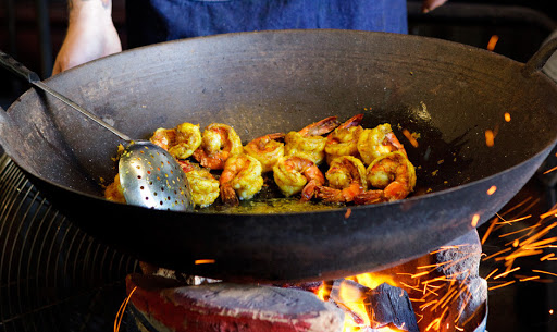 Using a slotted spoon, transfer shrimp to a platter. Skim crispy bits from oil and spoon over prawns. Serve with Coconut Rice.