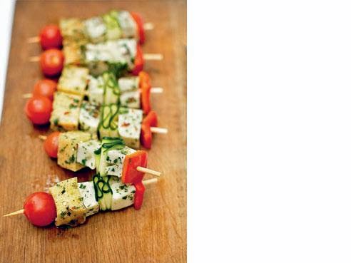 2 Spear a focaccia cube onto a skewer, follow with a cube of haloumi, then thread on a ribbon of courgette so it resembles a concertina. Add another haloumi cube, a piece of pepper and finish with a tomato. Repeat with remaining skewers and ingredients.