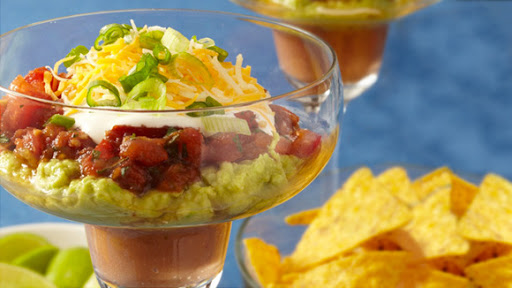 Salsa, cheese, avocado, beans, and Mexican-style veggies are layered together in this south-of-the-border chip dip. Margarita glasses make for a super-cool presentation, but everything can go in the same dish if you don’t have the time.