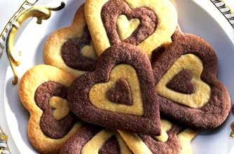Grease and flour 2 large baking sheets. On a lightly floured surface, use a floured rolling pin to roll out half of the plain dough 3mm (1/8-inch) thick. Keep the remaining dough refrigerated. Using a floured 8cm (3¼-inch) heart-shaped cutter, cut the dough into hearts. Place the hearts about 5mm (¼-inch) apart on one baking sheet. Repeat with remaining plain dough and trimmings, then repeat with the chocolate dough, placing hearts on the second baking sheet. Refrigerate until the hearts are firm - about 20 mins.