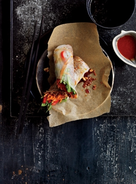 4. Fill a shallow pan large enough to set the rice papers in with hot water and soak one rice paper until softened, about 15 seconds. Remove and place 1 ⁄3 cup of the quinoa filling down the center of the paper. Fold the top and bottom edges over the mixture, then fold one of the remaining sides over the top and roll tightly. Slice on the diagonal and continue with remaining papers and quinoa filling