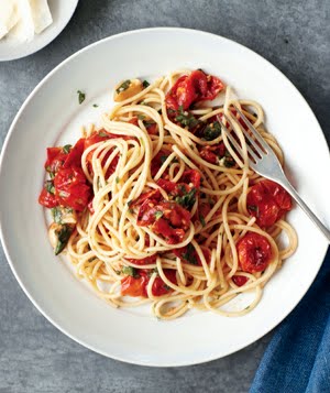 3.Toss the pasta with the tomatoes, herbs, and the remaining tablespoon of oil. Serve with the Parmesan and additional oil, if desired.