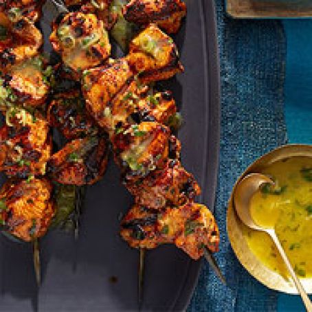 3. Heat a grill or grill pan over medium-high. Thread chicken onto 8 metal or soaked wooden skewers; season. Grill until the chicken is browned and cooked through, turning occasionally, 5 to 8 minutes. Drizzle with the vinaigrette before serving.