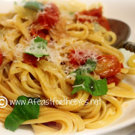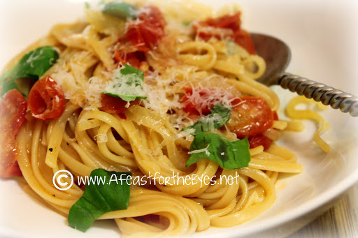 Tomatoes and Basil are a perfect match, and pasta is one of my favorite fast dinners to make, at home. This recipe is nothing short of a cooking miracle-- just add pasta, and the rest of the ingredients to a large sauté pan...add water and cook for 9 minutes. You get fast and delicious pasta with a creamy sauce-- without the cream! This recipe is a keeper, for sure. To see how I made this, please click on the recipe source to my food blog, "A Feast for the Eyes.