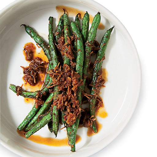 Heat a large wok or skillet over high heat for 5 minutes. Drizzle in the remaining 1/4 cup of oil, add the green beans and cook for 2 to 3 minutes, tossing every 30 seconds; the beans are done when they’re tender and blistered in spots. Drain off the oil. Stir in 1/4 cup of the XO sauce; toss until the beans are evenly coated. Season with salt and pepper and transfer to a platter. Serve with lemon wedges.