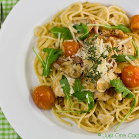 9.Add the chicken to the pan and toss lightly so that chicken will warm up. Serve the pasta on the serving plates, top with the chicken and sauce. Garnish with arugula and sprinkle grated Parmesan cheese. Serve immediately.