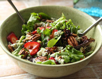 Put spinach, blueberries or strawberries, pecans, blue cheese together in a salad bowl. Mix Blueberry + lavender Jam if using blueberries and Strawberry + Basil jam if using strawberries, vinegar, olive oil, salt & pepper together. Toss salad with dressing. Delicious!