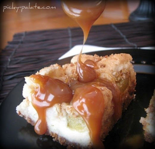 2. Place cream cheese, sugar and vanilla into a mixer; beat until smooth. Pour over crumbled cookie dough layer. Bake for 25 minutes then remove from over. Top with 3/4 of the apple pie filling (I chose to just add part, but you can add the whole can if desired). Next top with remaining cookie dough, breaking off into little pieces evenly over top. Sprinkle with crushed granola bars and bake for 30-35 minutes or until toothpick comes clean from center. Let cool completely then cut into squares. Melt caramels and half and half according to package directions. Drizzle over each bar. Refrigerate leftovers.