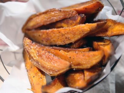 Sweet potato fries in restaurants are usually double-deep-fried; it’s difficult to make them crisp in an oven, but this recipe does the trick at the last minute with brown sugar and spices.