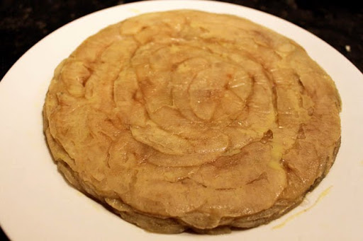 Preheat the oven to 160 degrees. Peel and core the apples, quarter and slice them as thinly as you can. I used a peeler.