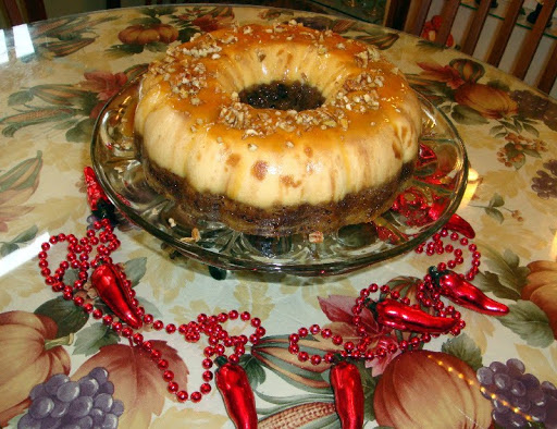 Invert a large, rimmed serving platter over the Bundt pan, grasp tightly together, giggle a little and flip over. Remove the pan and scrape any remaining cajeta from the pan onto the cake, garnish with chopped pecans and serve!