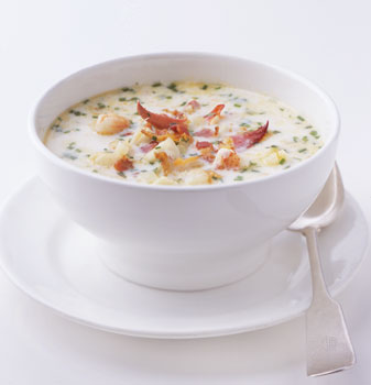 Add shrimp, scallops, and salt and simmer, stirring occasionally, until shellfish is just cooked through, 3 to 5 minutes. Stir in lobster and half of herbs and simmer 1 minute. Serve chowder topped with bacon and remaining herbs.