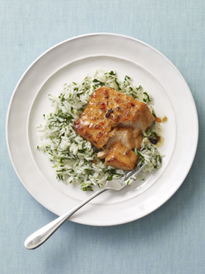 Place the salmon on a foil-lined broiler-proof baking sheet. Season with ¼ tsp pepper and broil for 5 minutes. Spoon the jelly mixture over the salmon and broil until opaque throughout, 2 to 4 minutes more. Serve with the rice.